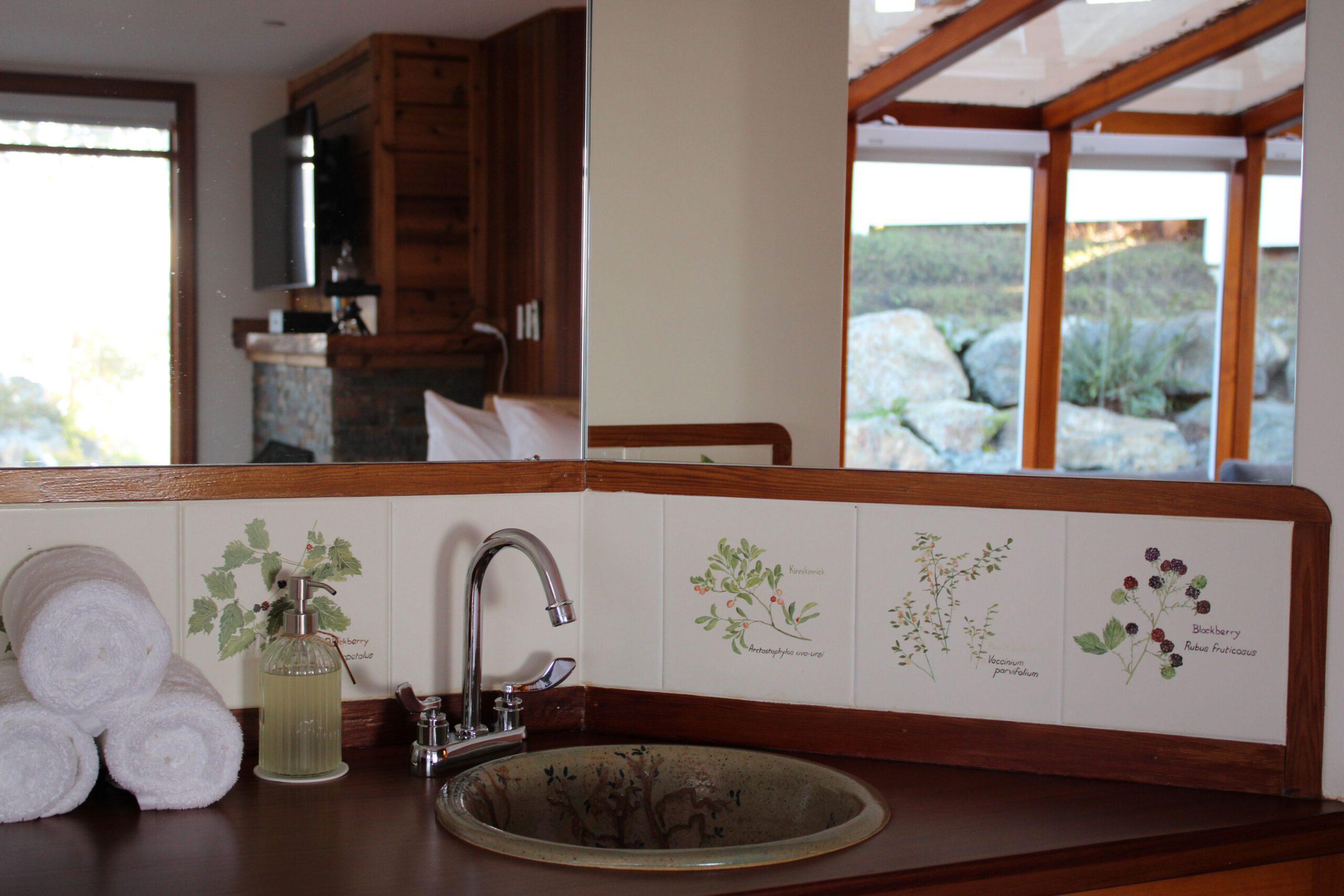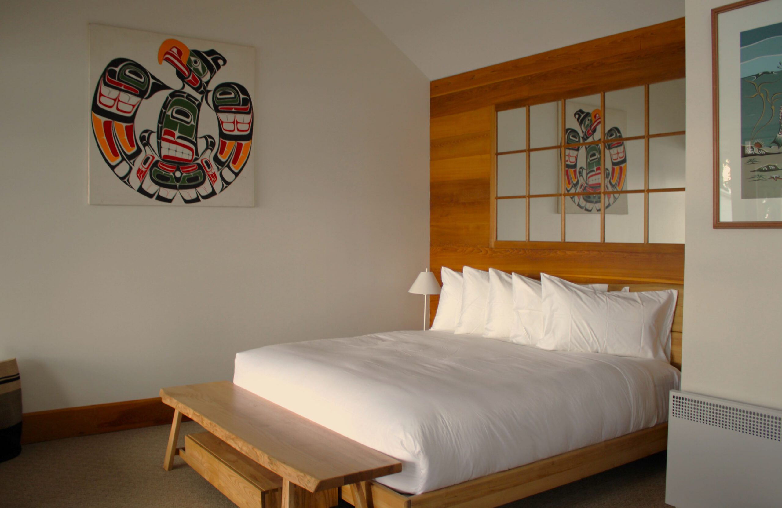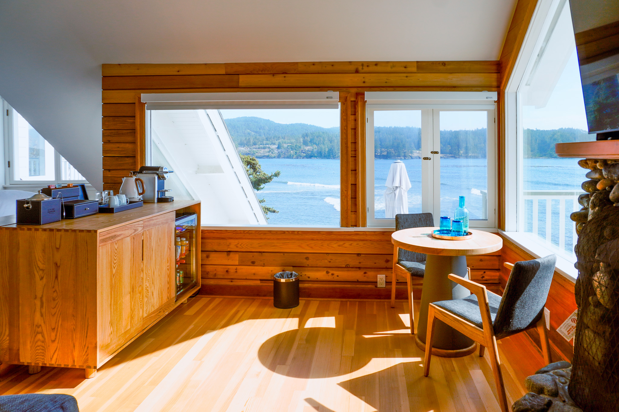 Designed in collaboration with Kwakwaka’wakw artist and Sooke resident Victor Newman, this spacious suite features a double-wide balcony, soaker tub, double-sided fireplace, and original carvings and artwork by Newman himself.